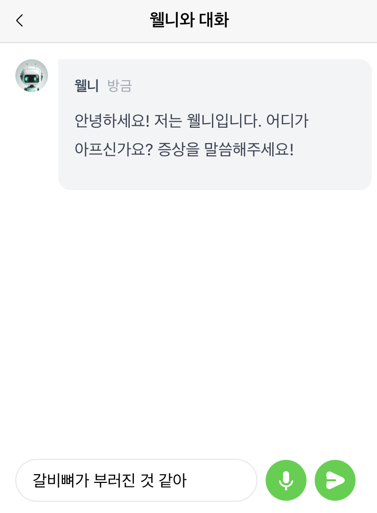 이 페이지에서현재 증상이 심각한지 알고 싶어요 현재 상황이 응급 상황인지 판단하기 어려울 때가 있지 않으신가요? 웰니에게 위급성 확인하기 메인 화면에서 음성 상담 버튼을 클릭합니다.